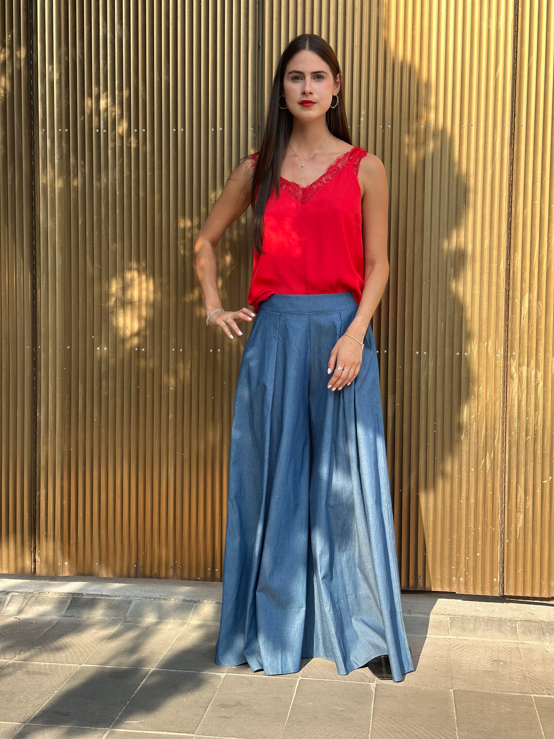 Blusa tipo satín con delicados detalles de encaje en los tirantes y el cuello. Su escote en V y caída suave aportan un toque femenino y elegante. Disponible en dos colores vibrantes: rosa y rojo. Perfecta para combinar con jeans o faldas y elevar cualquier look.