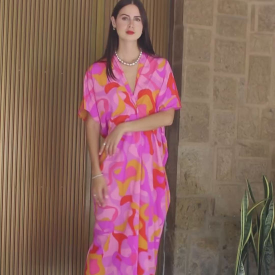 Vestido tipo caftán en un tono rosa vibrante con estampado. Su diseño relajado con cuello en V, manga corta y largo midi lo convierte en una opción fresca, cómoda y femenina. Perfecto para días cálidos o para un look casual con estilo.