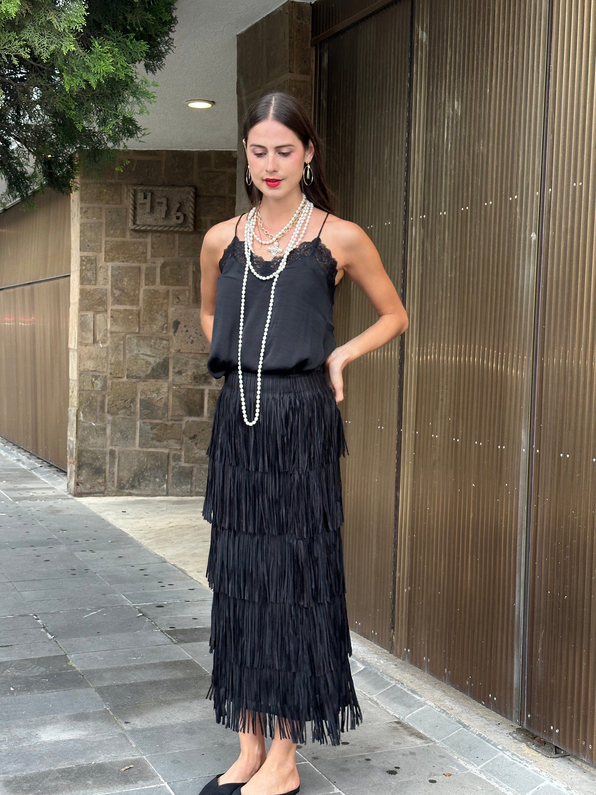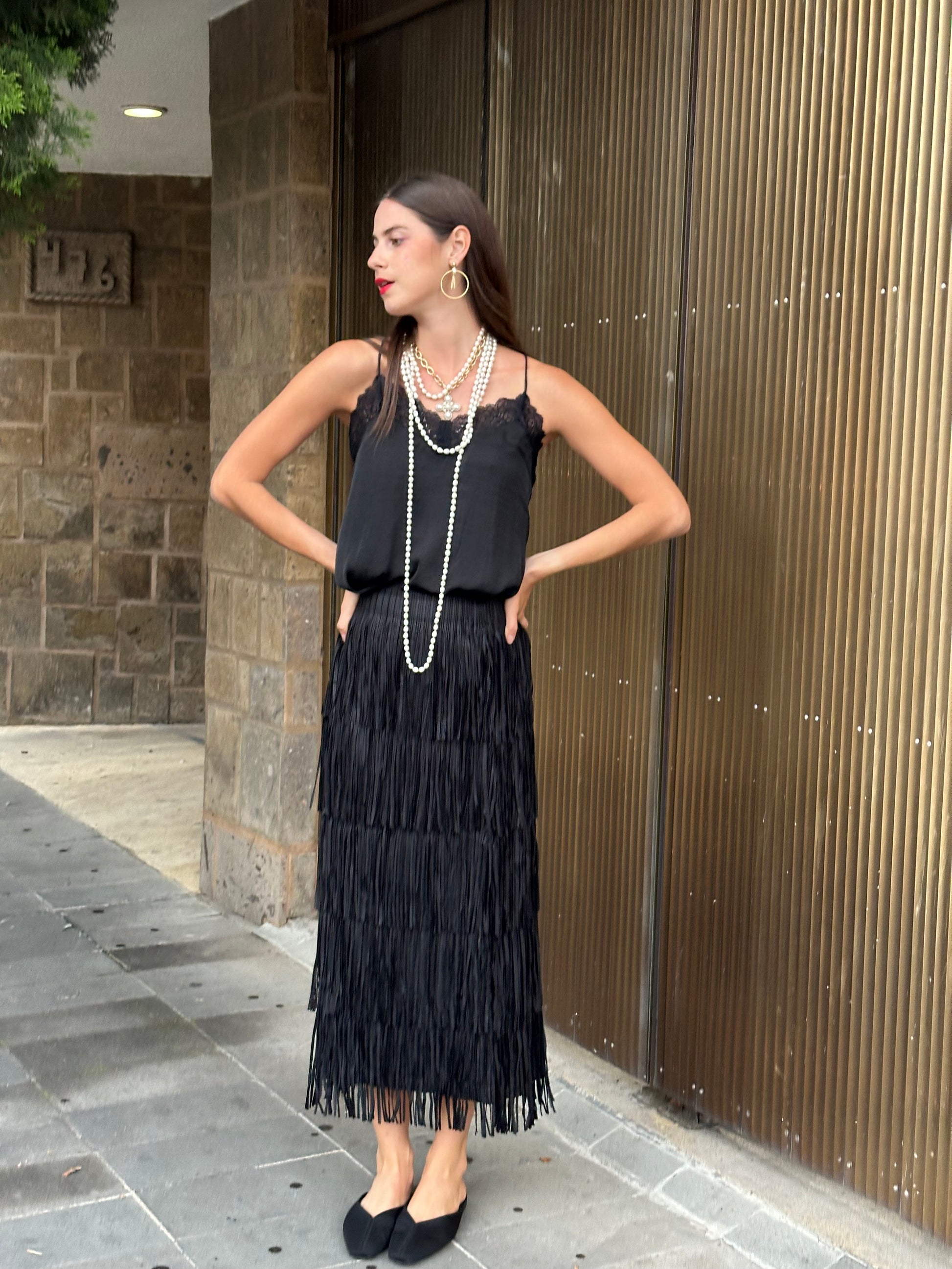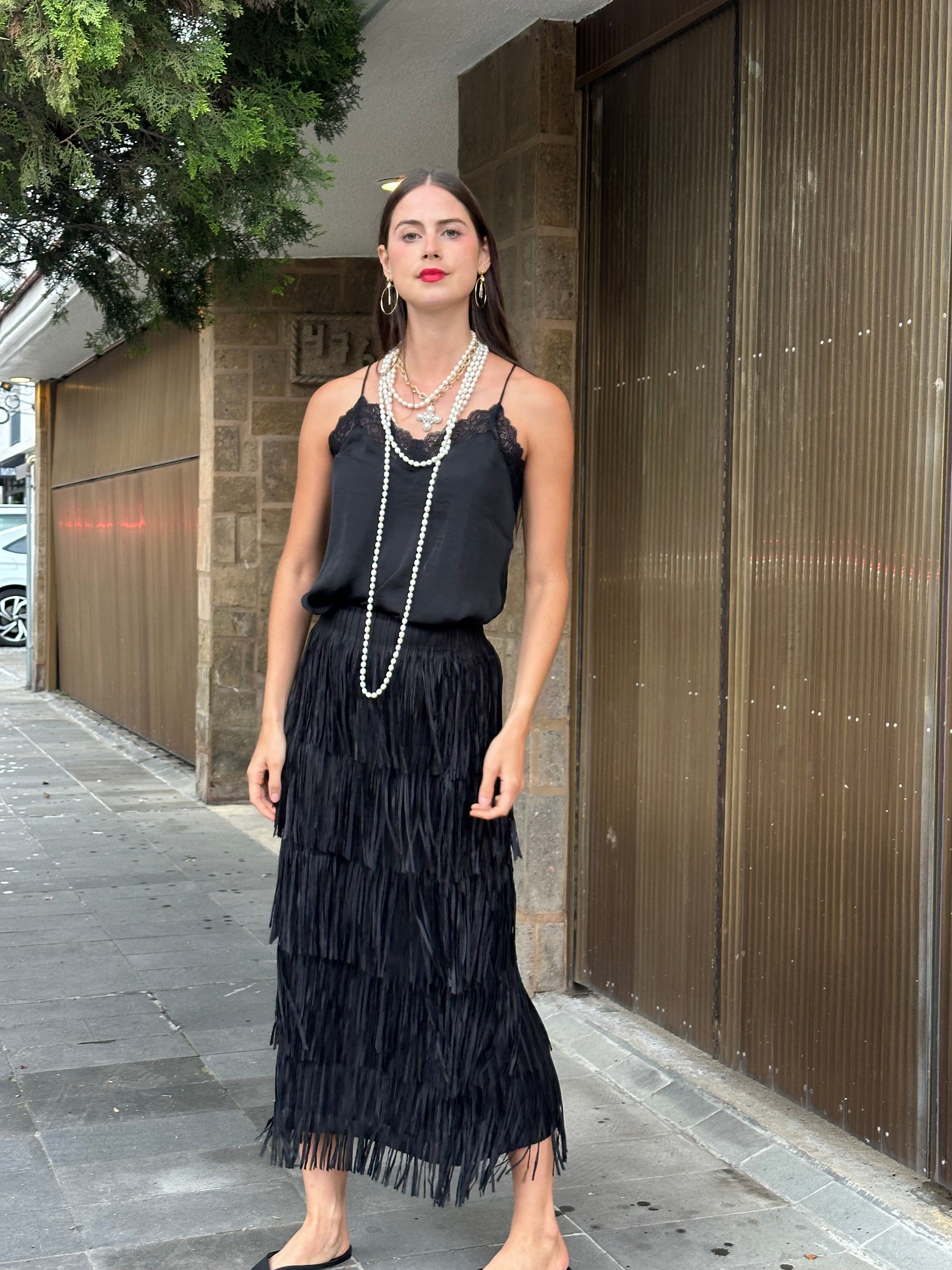 Falda en color negro con detalle de flecos en todo el diseño. Cuenta con cintura elástica para un ajuste cómodo y versátil. Ideal para darle movimiento y estilo a cualquier look.