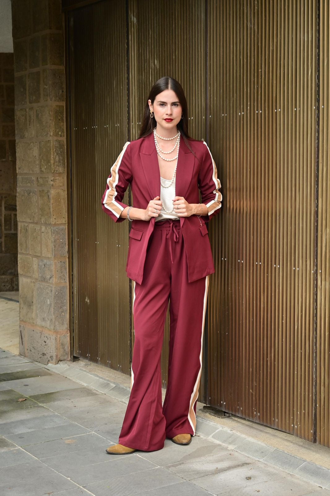 Blazer color cherry con líneas color blanca y camel en mangas.